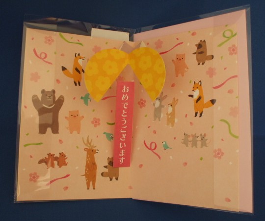 店長による商品解説 動物たちがくす玉を割る様子を表現した春のお祝いカードです。