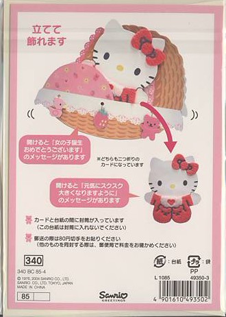 | 店長による商品解説 | おもて表紙の一部はウレタン素材で出来ています。 2つ折カードを開けると「女の子誕生 おめでとうございます」のメッセージがあります。 2つ折ミニカードになってるキティを開けると「元気にスクスク大きくなりますように」のメッセージがあります。 |